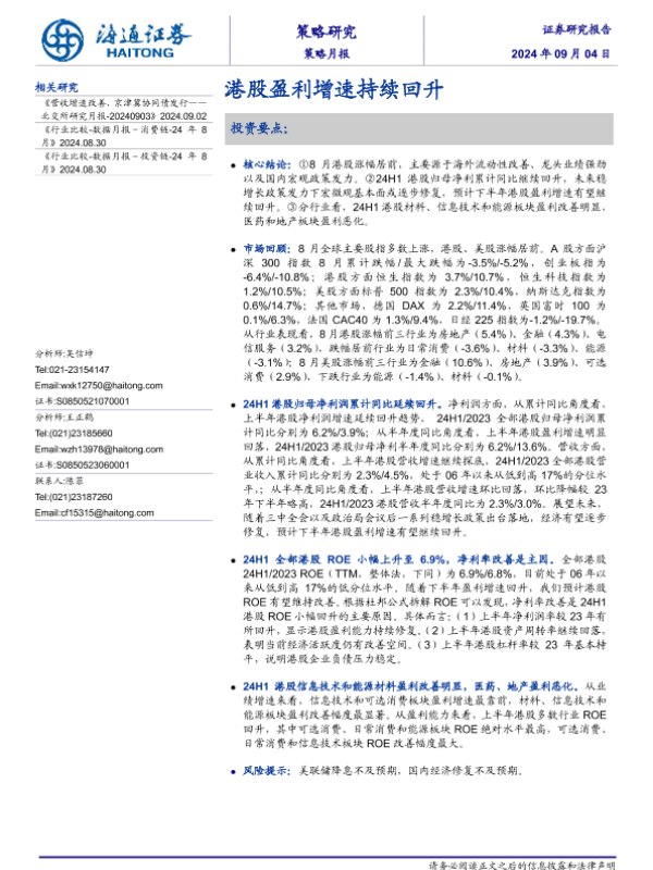 【海通证券】【20240904】策略月报:港股盈利增速持续回升-10页 行业研究