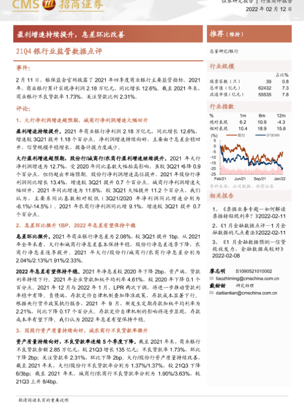 【海通证券】【20220212】21Q4银行业监管数据点评:盈利增速持续提升,息差环比改善-5页 证券期货研究报告