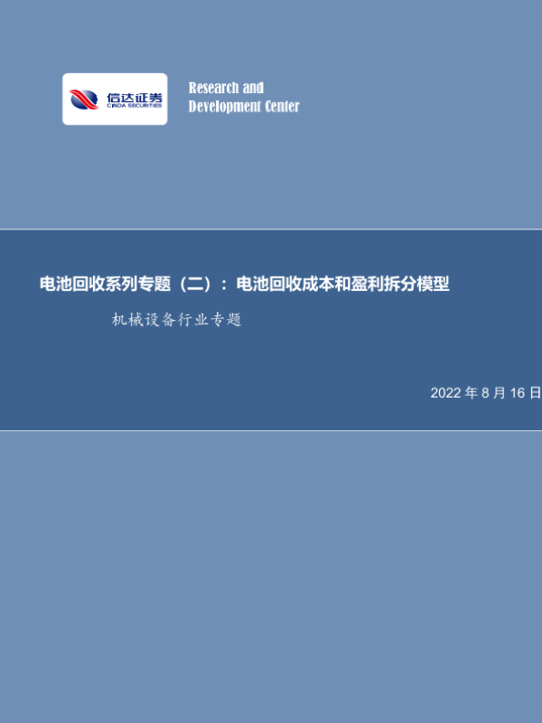 【信达证券】【20220816】电池回收系列专题(二):电池回收成本和盈利拆分模型-16页 行业研究