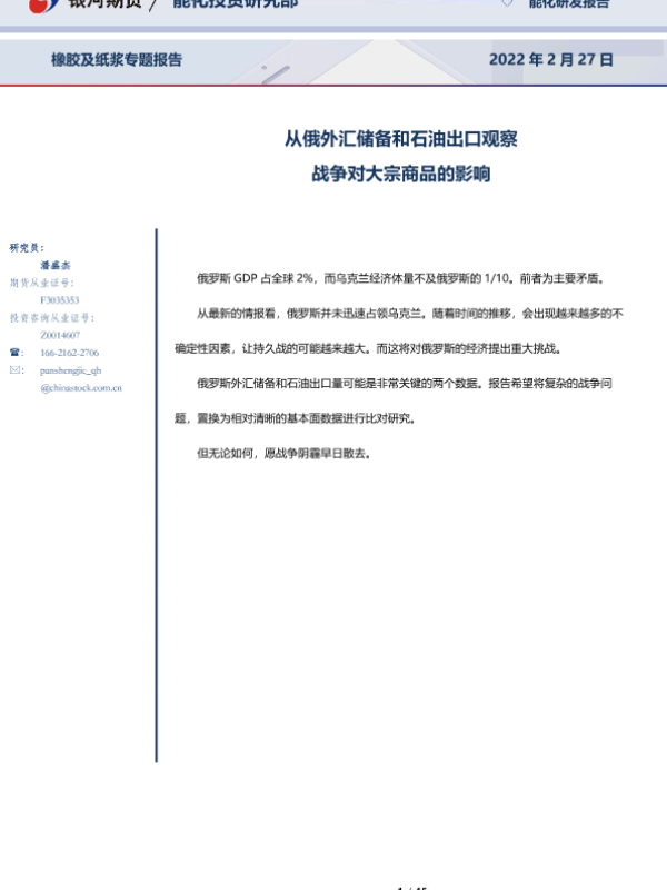 【银河期货】【20220227】橡胶及纸浆专题报告:从俄外汇储备和石油出口观察,战争对大宗商品的影响-15页 行业研究