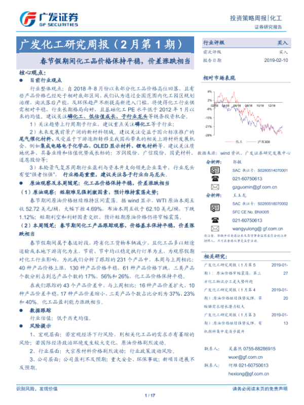 【广发证券】【20190210】广发化工研究周报(2月第1期):春节假期间化工品价格保持平稳,价差涨跌相当-17页 行业研究