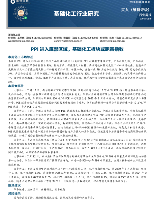 【国金证券】【20230716】基础化工行业研究:PPI进入底部区域,基础化工板块或跑赢指数-25页 行业研究
