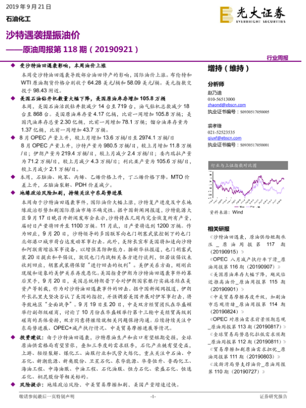 【光大证券】【20190921】原油周报第118期:沙特遇袭提振油价-12页 行业研究