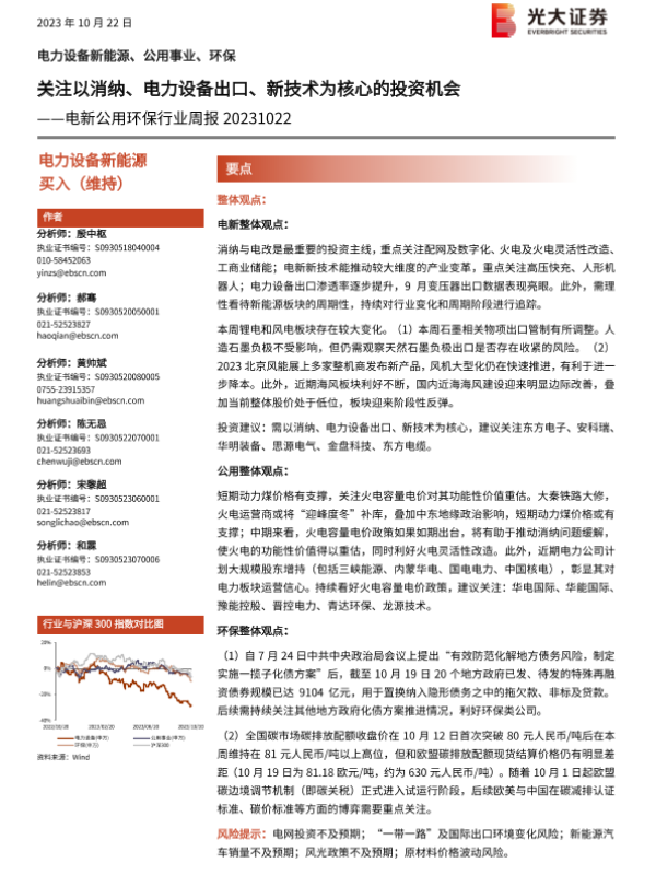 【光大证券】【20231022】电新公用环保行业周报:关注以消纳、电力设备出口、新技术为核心的投资机会-22页 行业研究