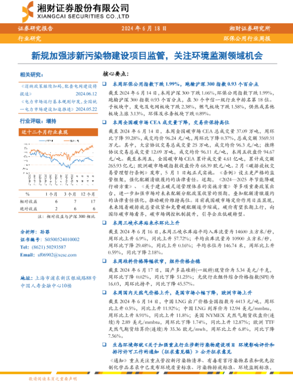 【湘财证券】【20240618】环保公用行业周报:新规加强涉新污染物建设项目监管,关注环境监测领域机会-11页 行业研究