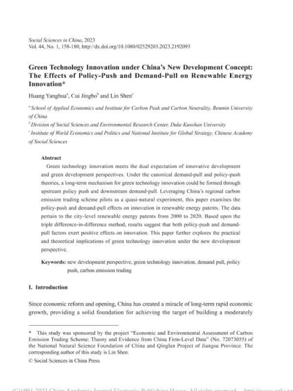 【Social Sciences in China Press】【20230101】新发展理念下的绿色技术创新:政策推拉和需求拉动对可再生能源创新的影响-23页 行业研究