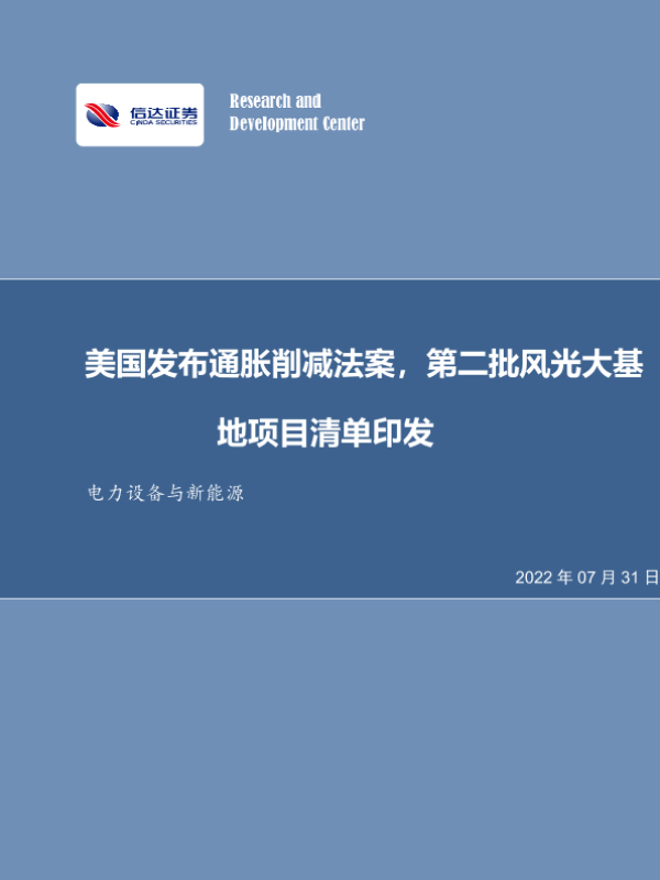 【信达证券】【20220731】美国发布通胀削减法案,第二批风光大基地项目清单印发-8页 行业研究