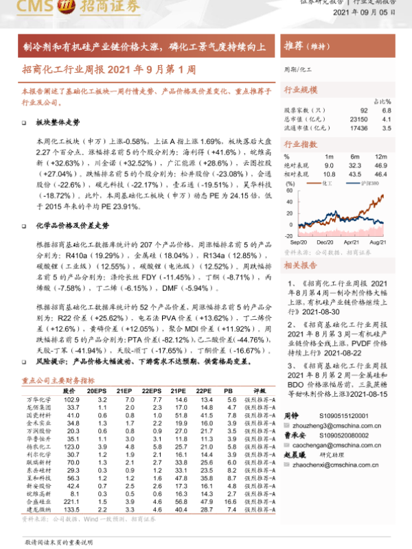 【海通证券】【20210905】化工行业周报2021年9月第1周:制冷剂和有机硅产业链价格大涨,磷化工景气度持续向上-23页 证券期货研究报告