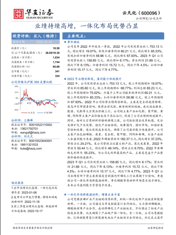 【华安证券】【20230505】云天化(600096)业绩持续高增,一体化布局优势凸显-25页 行业研究