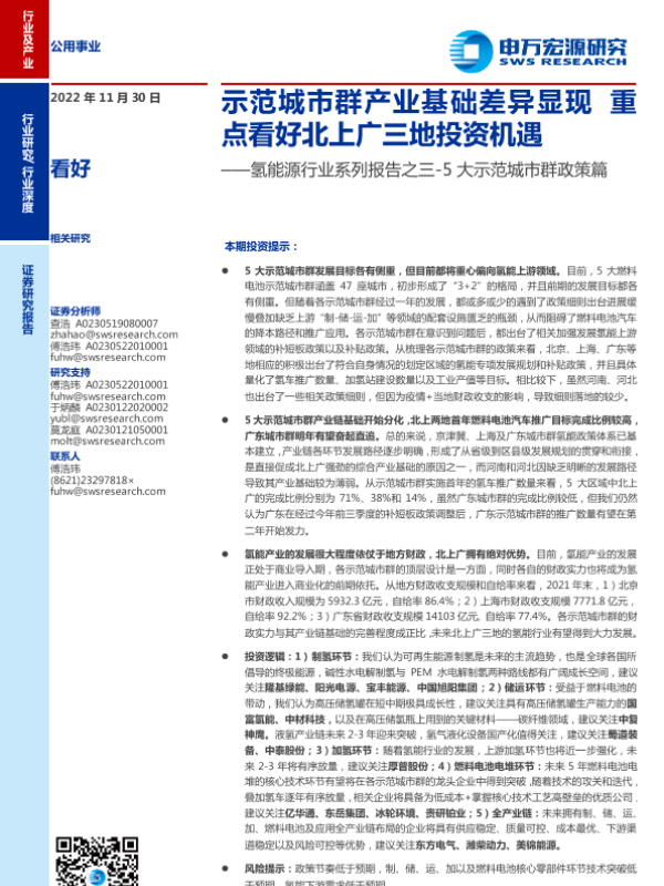 【申万宏源】【20221130】氢能源行业系列报告之三_5大示范城市群政策篇:示范城市群产业基础差异显现重点看好北上广三地投资机遇-29页 行业研究