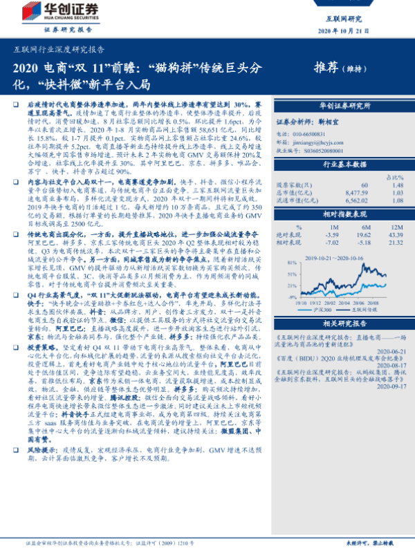 【华创证券】【20201021】2020电商“双11”前瞻:“猫狗拼”传统巨头分化,“快抖微”新平台入局-18页 行业研究
