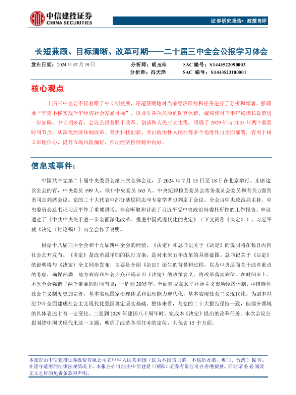 【中信建投证券】【20240719】二十届三中全会公报学习体会:长短兼顾、目标清晰、改革可期-16页 行业研究