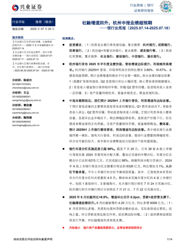 【兴业证券】【20250720】银行业周报:社融增速回升,杭州中报业绩超预期-14页 证券期货研究报告