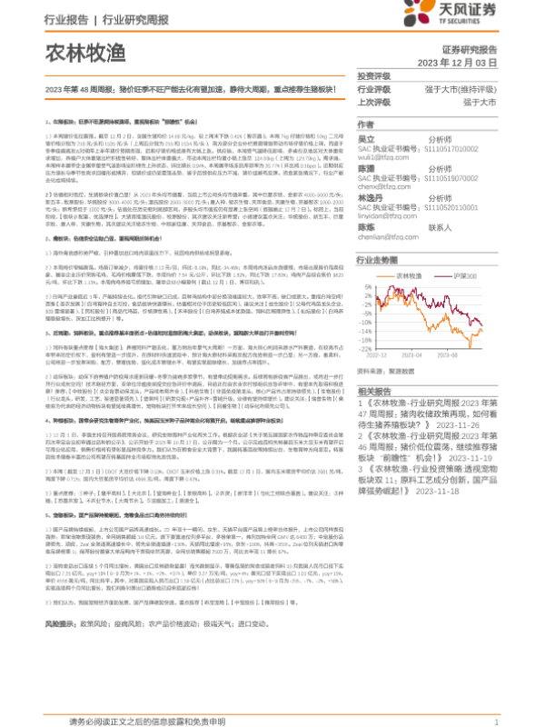 【天风证券】【20231203】农林牧渔2023年第48周周报:猪价旺季不旺产能去化有望加速,静待大周期,重点推荐生猪板块!-15页 行业研究