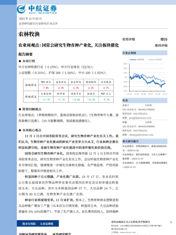 【中航证券】【20231202】农业周观点:国常会研究生物育种产业化,关注板块催化-13页 行业研究