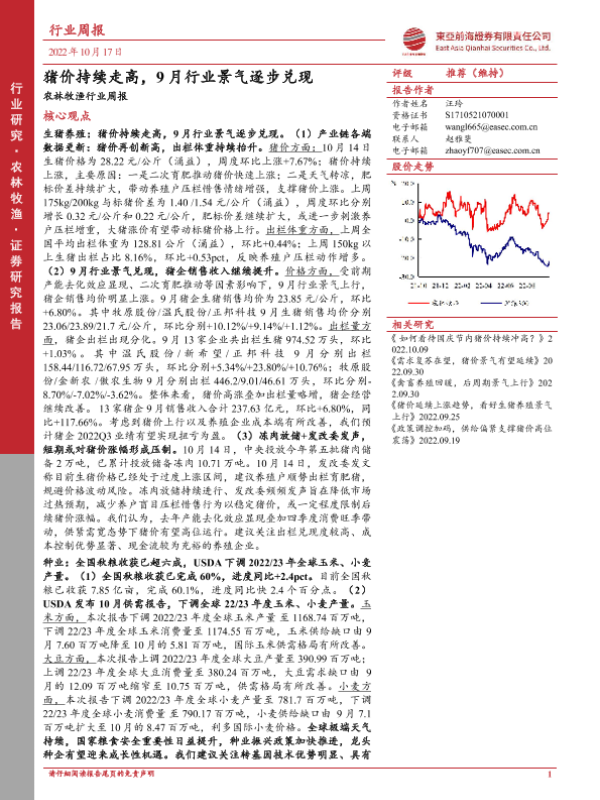【东亚前海证券】【20221017】20221017-东亚前海证券-农林牧渔行业周报:猪价持续走高,9月行业景气逐步兑现-18页 行业研究