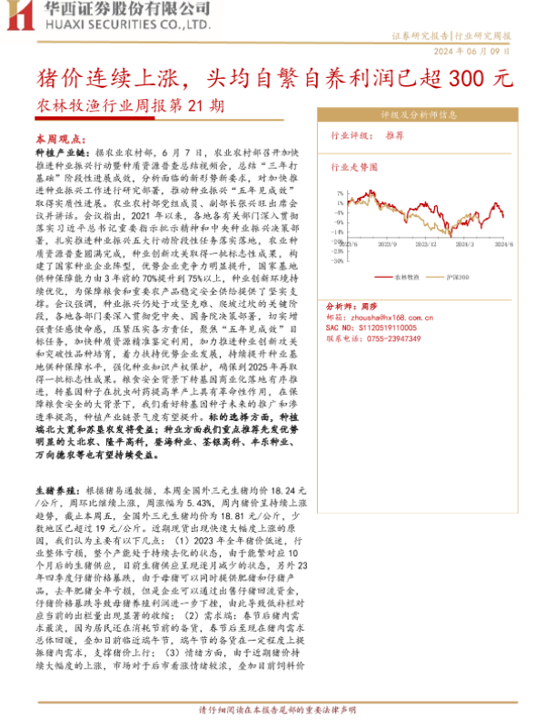 【华西证券】【20240609】20240609-华西证券-农林牧渔行业周报第21期:猪价连续上涨,头均自繁自养利润已超300元-25页 行业研究