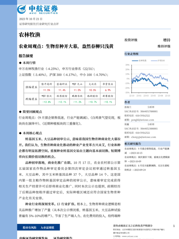【中航证券】【20231021】农业周观点:生物育种开大幕,盎然春柳只浅黄-14页 行业研究