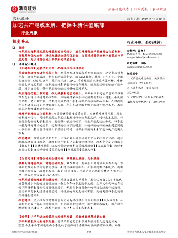 【浙商证券】【20231008】20231008-浙商证券-农林牧渔行业周报:加速去产能或重启,把握生猪估值底部-15页 行业研究