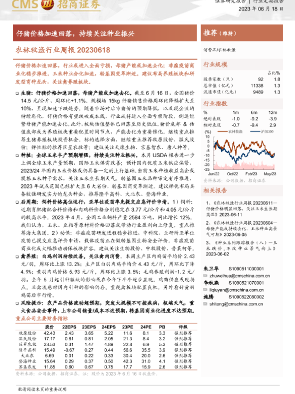 【海通证券】【20230618】20230618-招商证券-农林牧渔行业周报:仔猪价格加速回落,持续关注种业振兴-16页 行业研究