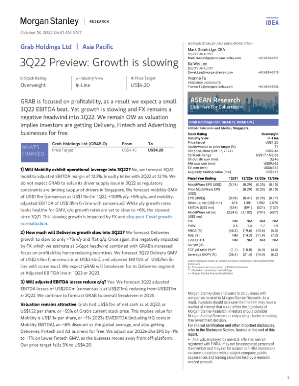 【Morgan Stanley】【20221018】Grab Holdings Ltd 3Q22 Preview Growth is slowing-18页 行业研究