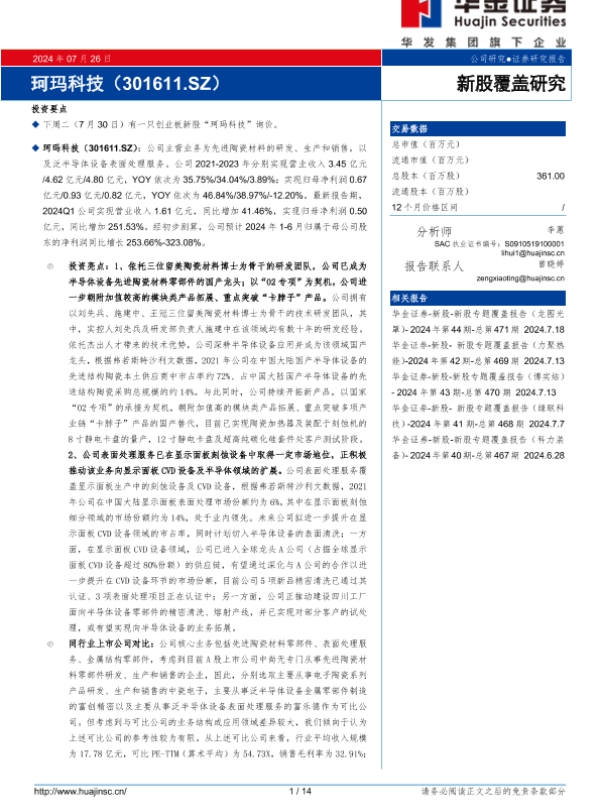 【华金证券】【20240726】珂玛科技(301611)新股覆盖研究-14页 行业研究