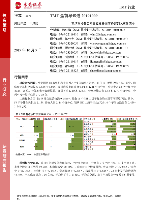 【东莞证券】【20191009】20191009-东莞证券-TMT盘前早知道:商汤科技等公司回应被美国商务部列入实体清单-6页 行业研究