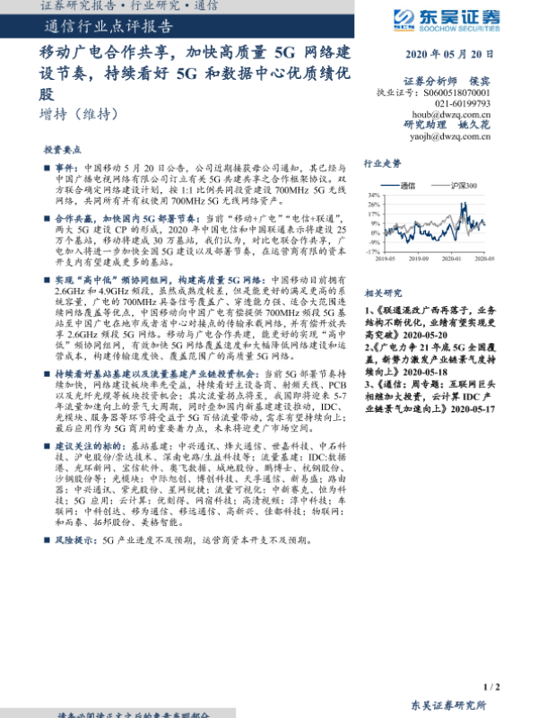 【东吴证券】【20200520】通信行业点评报告:移动广电合作共享,加快高质量5G网络建设节奏,持续看好5G和数据中心优质绩优股-2页 行业研究