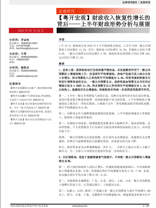 【粤开证券】【20230728】【粤开宏观】上半年财政形势分析与展望:财政收入恢复性增长的背后-18页 行业研究