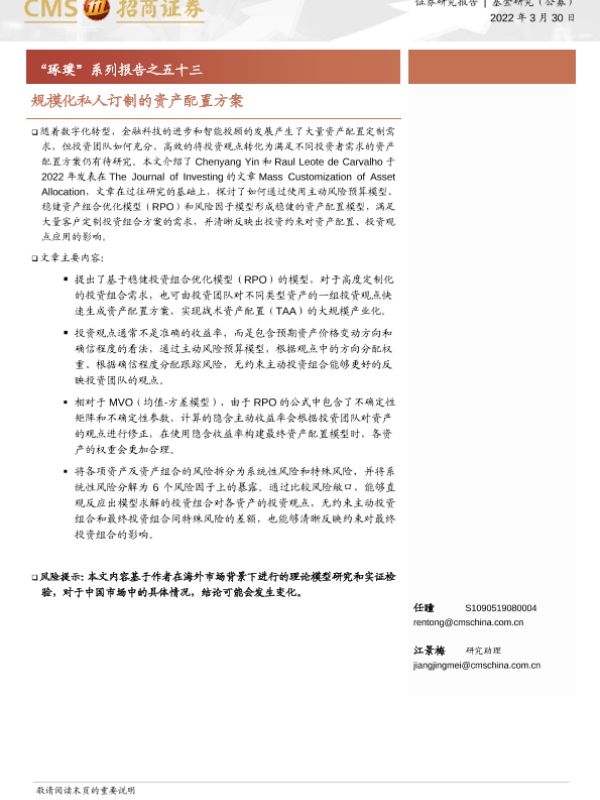 【海通证券】【20220330】规模化私人订制的资产配置方案-20页 行业研究