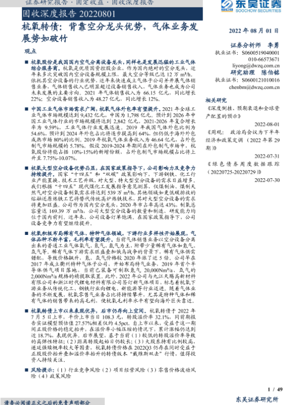 【东吴证券】【20220801】杭氧转债:背靠空分龙头优势,气体业务发展势如破竹-49页 行业研究