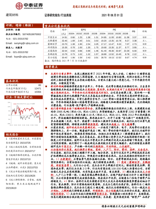 【中泰证券】【20210801】建筑材料行业:高端石英耗材龙头迎高光时刻;玻璃景气度高-25页 行业研究