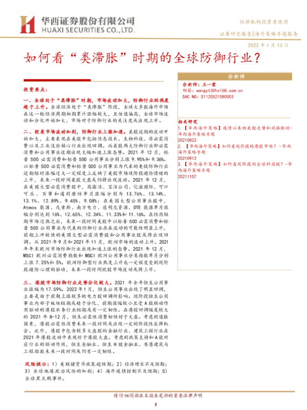 【华西证券】【20220113】海外策略专题报告:如何看“类滞胀”时期的全球防御行业?-19页 行业研究