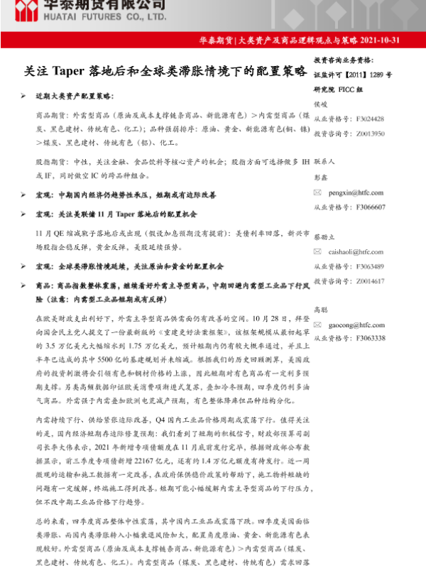 【华泰期货】【20211031】大类资产及商品逻辑观点与策略:关注Taper落地后和全球类滞胀情境下的配置策略-25页 行业研究