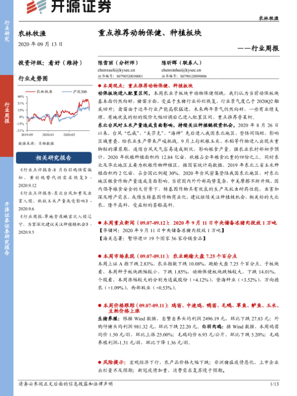 【开源证券】【20200913】农林牧渔行业周报:重点推荐动物保健、种植板块-13页 行业研究