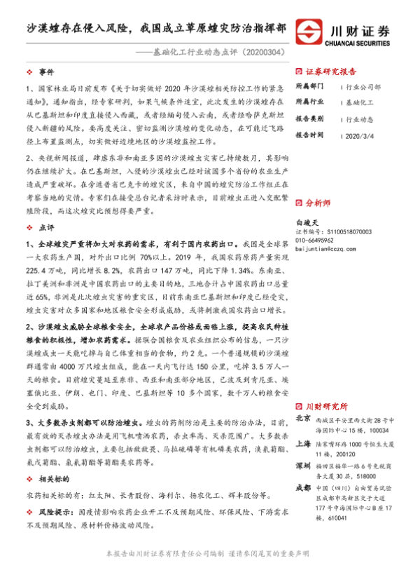 【川财证券】【20200304】基础化工行业动态点评:沙漠蝗存在侵入风险,我国成立草原蝗灾防治指挥部-2页 证券期货研究报告