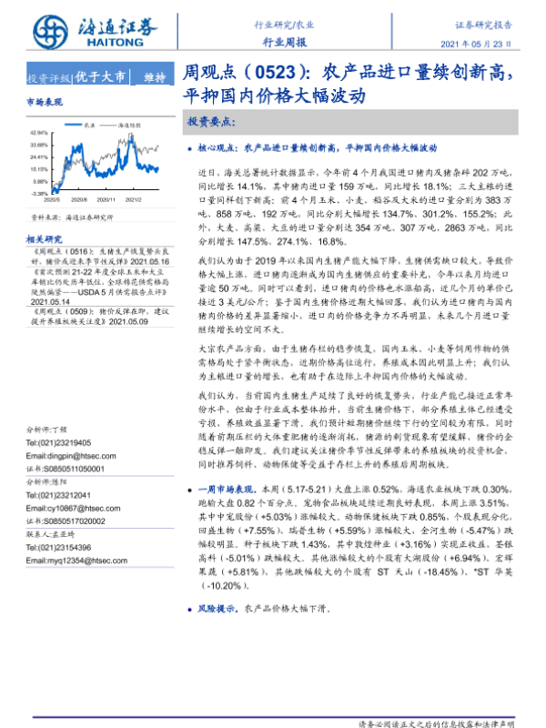 【海通证券】【20210523】农业周观点:农产品进口量续创新高,平抑国内价格大幅波动-4页 行业研究