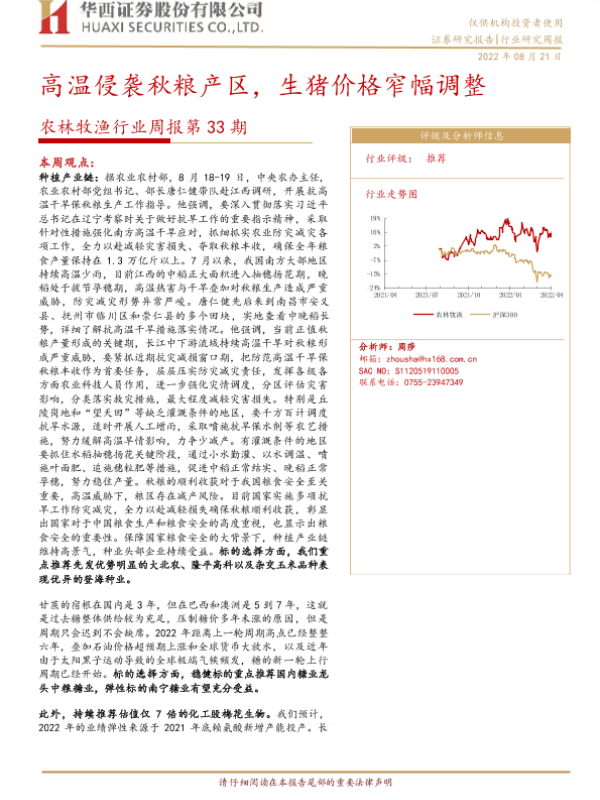 【华西证券】【20220821】农林牧渔行业周报第33期:高温侵袭秋粮产区,生猪价格窄幅调整-26页 行业研究