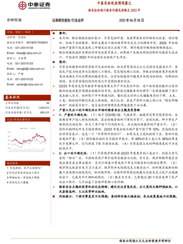【中泰证券】【20220605】中泰农林牧渔周观察之:粮农组织预计粮食问题或持续至2023年-6页 行业研究