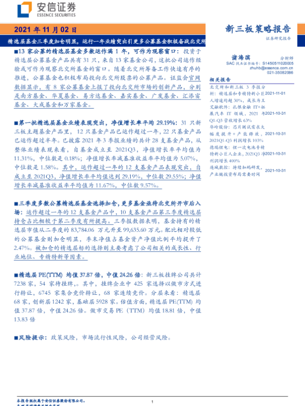 【安信证券】【20211102】新三板策略报告:精选层基金三季度加仓明显,运行一年业绩突出引更多公募基金积极备战北交所-21页 行业研究
