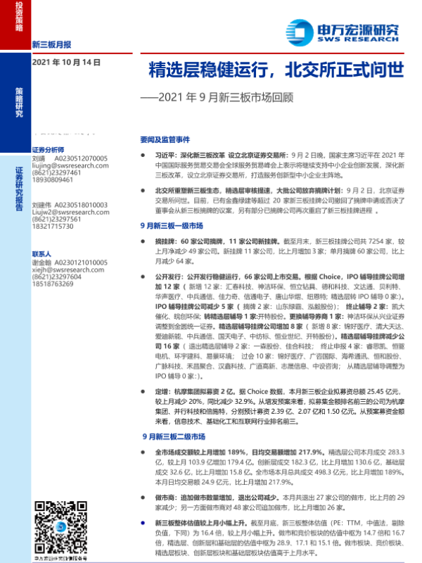 【申万宏源】【20211014】2021年9月新三板市场回顾:精选层稳健运行,北交所正式问世-21页 行业研究