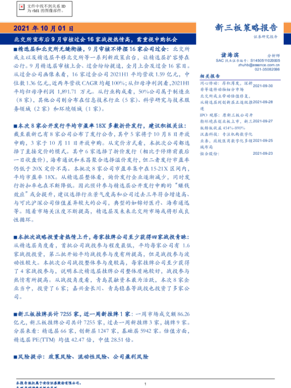 【安信证券】【20211001】新三板策略报告:北交所宣布后9月审核过会16家战投热情高,需重视申购机会-20页 行业研究