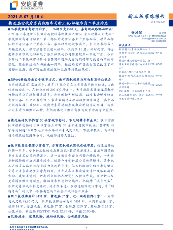 【安信证券】【20210718】评做市商二季度排名:精选层时代看券商战略布局新三板-18页 行业研究