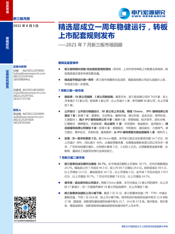 【申万宏源】【20210803】2021年7月新三板市场回顾:精选层成立一周年稳健运行,转板上市配套规则发布-21页 行业研究