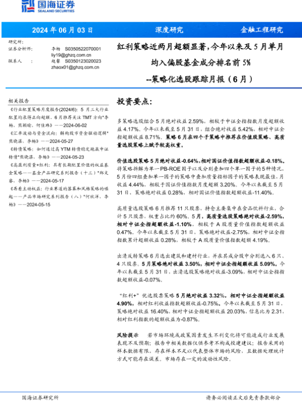 【国海证券】【20240603】策略化选股跟踪月报(6月):红利策略近两月超额显著,今年以来及5月单月均入偏股基金成分排名前5%-28页 行业研究