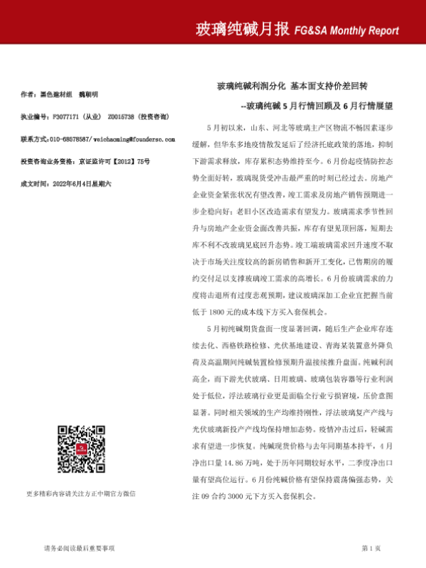 【方正中期期货】【20220604】玻璃纯碱5月行情回顾及6月行情展望:玻璃纯碱利润分化,基本面支持价差回转-30页 行业研究