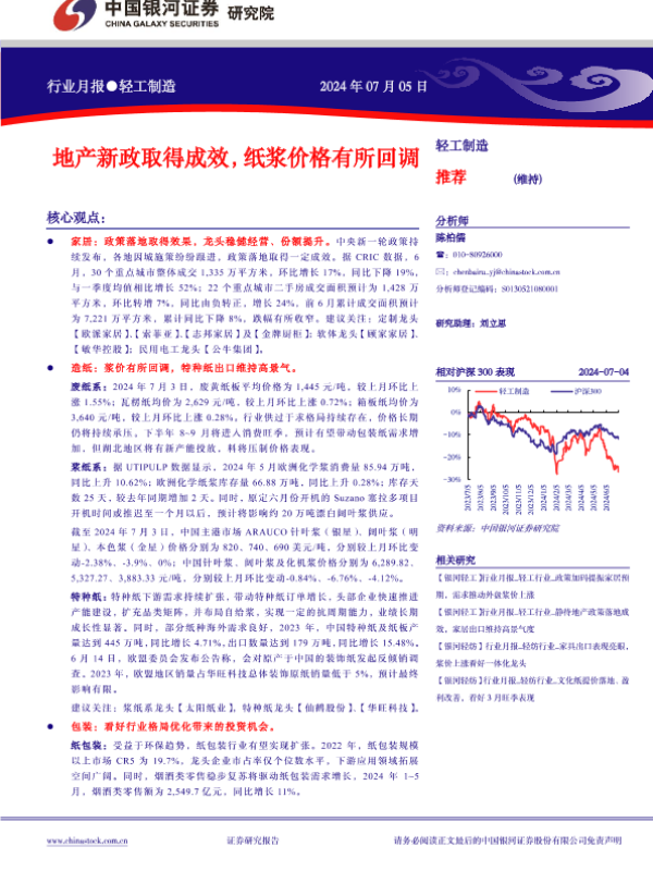 【银河证券】【20240705】轻工制造行业月报:地产新政取得成效,纸浆价格有所回调-21页 行业研究