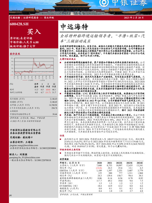 【中银证券】【20230228】中远海特(600428)全球特种船跨境运输领导者,“半潜+纸浆+汽车”三核驱动成长-37页 行业研究