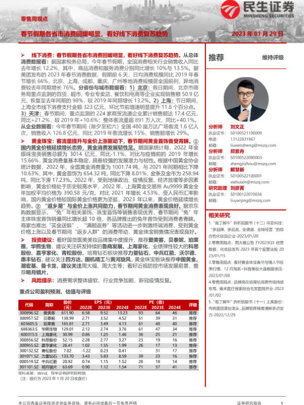 【民生证券】【20230129】零售周观点:春节假期各省市消费回暖明显,看好线下消费复苏趋势-17页 行业研究