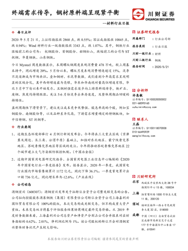 【川财证券】【20200521】材料行业日报:终端需求传导,钢材原料端呈现紧平衡-3页 证券期货研究报告